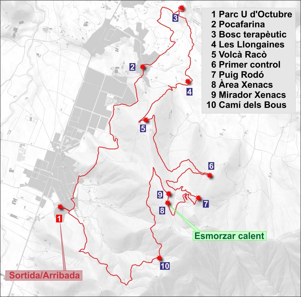 Ja tornem a tenir una altra edició de la marxa dels llenyataires. El punt de sortida és al parc 1 d’octubre, al costat de l’escola la Bòbila. Travessarem tot el poble, passant pel seu contorn nord, el que ens permetrà una bonica vista del poble i alguns dels seus encants com l’església de Sant Pere amb la seva forma característica de dos campanars. Passarem per la zona de la Piscina Municipal de Les Preses on seguidament trobarem un camí que ens porta a la casa de La Fageda, continuant per un tram de bici carril fins a arribar al veïnat de Pocafarina. Havent travessat aquest nucli ens endinsarem a una de les parts mes boniques d’aquesta marxa, possiblement desconeguda per alguns de vosaltres, que és el bosc terapèutic singular de Can Serra, també conegut com el bosc “Salvador Grau” on hi trobarem una gran varietat d’espècies d’arbres. Continuarem pel recorregut de la marxa arribant al bosc de Les LLongaines que donarà pas a la pujada que ens porta al volcà Racó passant pel bosc de L’Avellana. Un cop assolit el volcà Racó prenem el corriol que es dirigeix a les Ermites del corb, però abans de trobar l’Ermita de Sant Miquel del Corb haurem de fer presència al primer control de la marxa on caldrà agafar forces per afrontar la part més exigent del recorregut que, remuntant pel Clot de Les Grípies, arriba al Puig Rodo, mirador des d’on contemplarem unes vistes impressionats. Comencem la baixada per un recorregut botànic que ens portarà a l’àrea recreativa de Xenacs on gaudirem d’un merescut esmorzar calent i fred, amb tot el que puguis necessitar per reposar les forces. Quan reprendrem la caminada, molt a prop, ens trobarem el mirador de Xenacs, no menys esplèndid que l’anterior. La baixada per la serra de Xenacs la farem pel bonic camí dels Bous, tot just restaurat. Sense adonar-nos només queda un darrer passeig que ens porta fins el punt on s’acabarà la nostra ruta d’enguany.